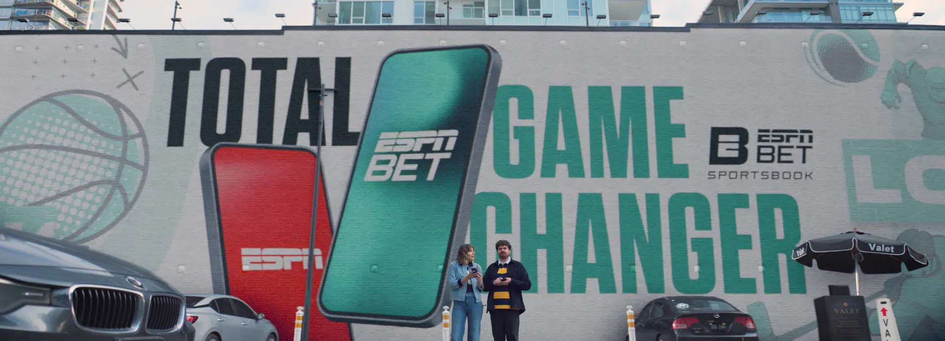 A comedic reveal underscores the obliviousness : An ESPN BET blimp slowly passing by in one and a towering ESPN BET mural behind our characters in the other.