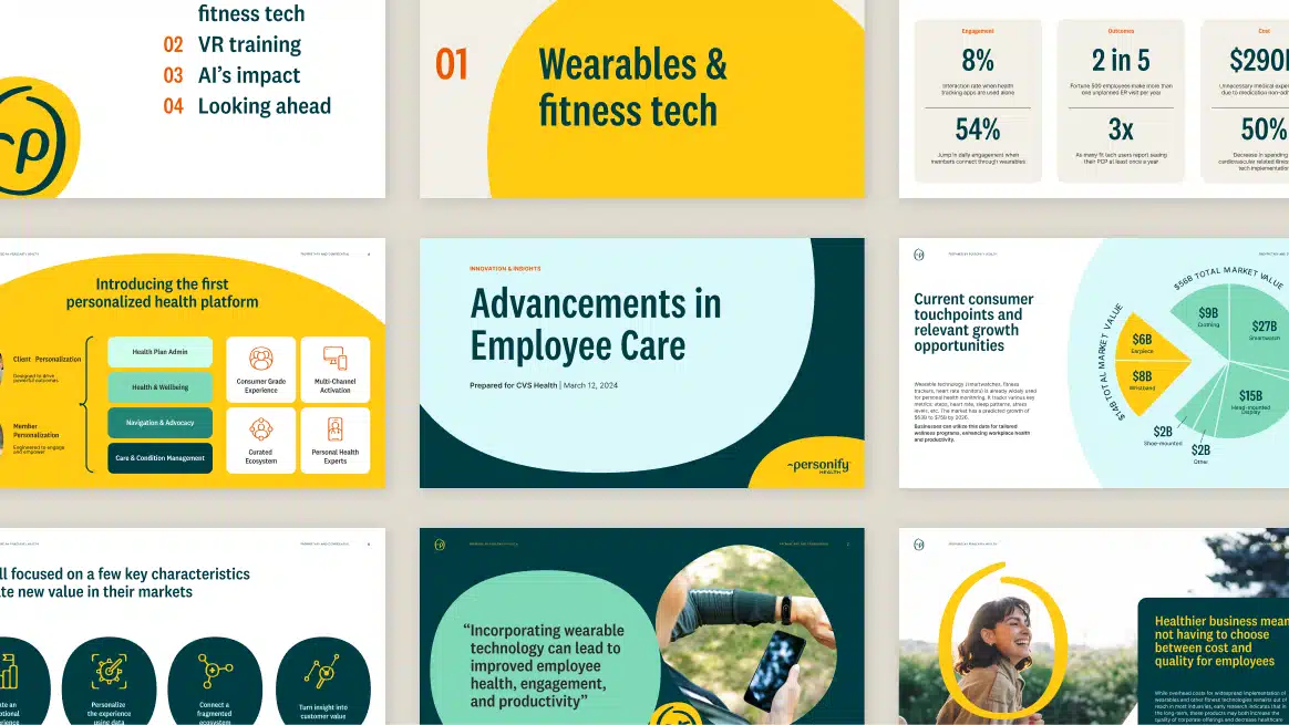 From there we explored numerous territories and styles before ultimately selecting the name Personify Health, which emphasizes the company’s commitment to bringing more humanity to a category that is too often lacking it. The name was supported with a new tagline, “Because health is personal” and a bold new verbal identity. The brand voice and messaging strategies were modular enough to flex for various audiences and content types and felt freshly disruptive to break from the informative, serious expressions of their competitive set while underscoring the company’s credibility.